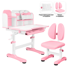 Также в комплекте есть растущий стул, который регулируется по высоте, и его спинка также регулируется по высоте и глубине. На ножках стола есть вспомогательная ростовая наклейка, она показывает соотношение роста ребенка с высотой стула и помогает подобрать нужную высоту. Прочный металлический каркас позволяет пользоваться партой длительное время. Комплект является эргономичным и помогает сохранять осанку ребенка здоровой.